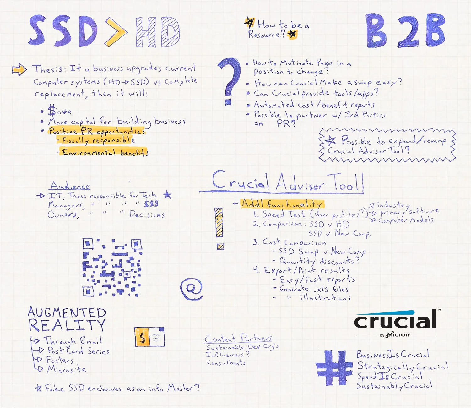 The linked document came out of that brainstorming (spurned by our conversation Friday), and centers on getting businesses to swap old hard drives for Crucial SSDs. I'm sharing it because it illustrates, to a degree, how I approach marketing puzzles. It's rough and obviously done without having access to current plans, messaging, campaigns, already dismissed concepts, etc., and shouldn't be taken as a proposal.